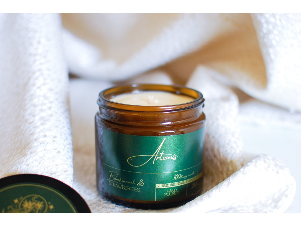 250 ml ručně vyrobená svíčka inspirována Bohyní Artemis - Bohyně lovu, divoké přírody, Měsíce, panenství a ochránkyně mladých dívek.