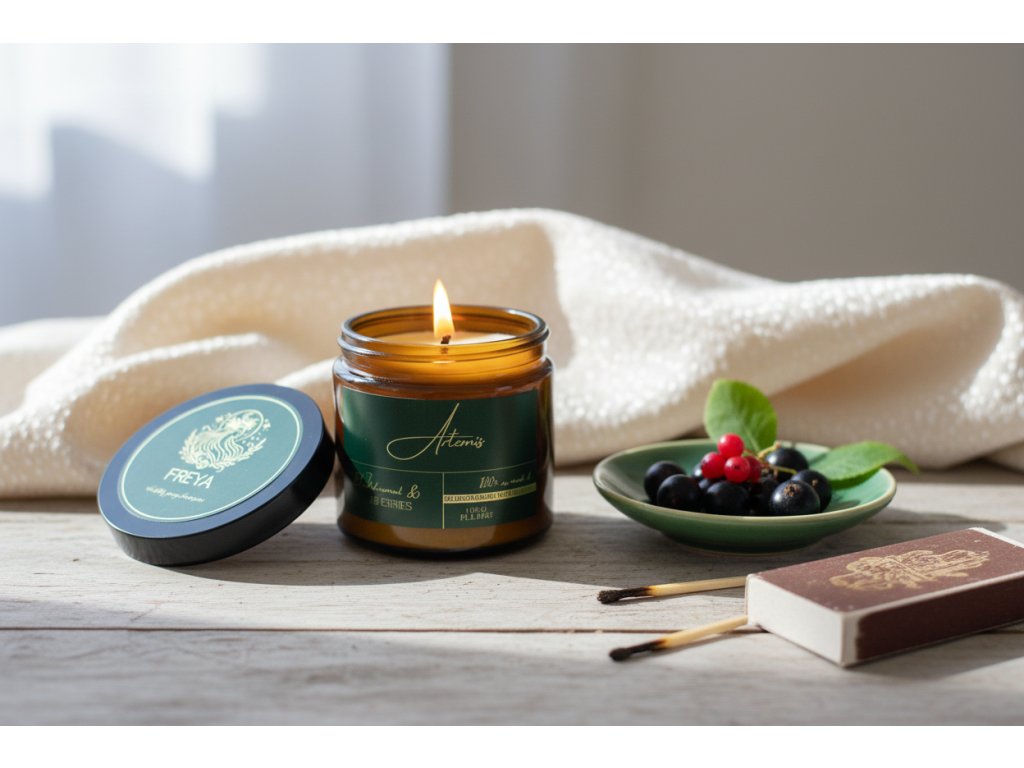 Artemis je řecká bohyně lovu, divoké přírody a Měsíce. Je silná, svobodná a nezávislá. Tato svíčka zachycuje její esenci – je to vůně procházky hlubokým letním lesem, kde vzduch voní po sladkých jahodách, zralém rybízu a divokém ovoci. Čistá energie přírody ve vašem domově.